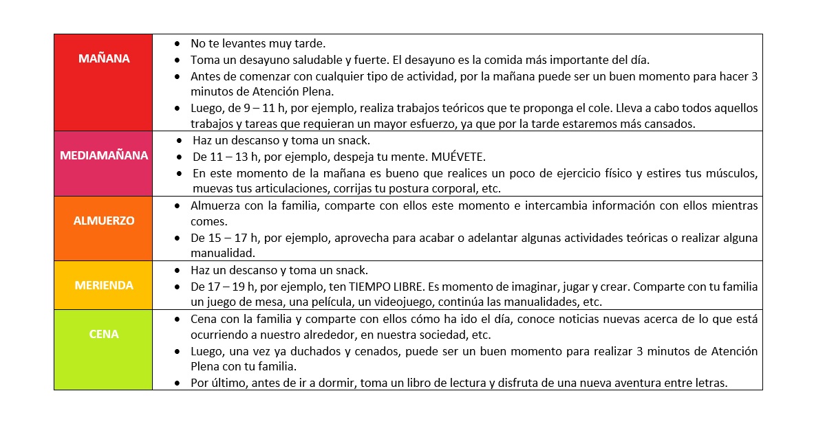 Ya que pasaremos mucho tiempo en nuestros hogares, es importante que tengamos establecido un horario igual o similar al que seguimos durante el curso escolar. No obstante, este horario puede variar y ser flexible debido a las circunstancias en las que nos encontramos.