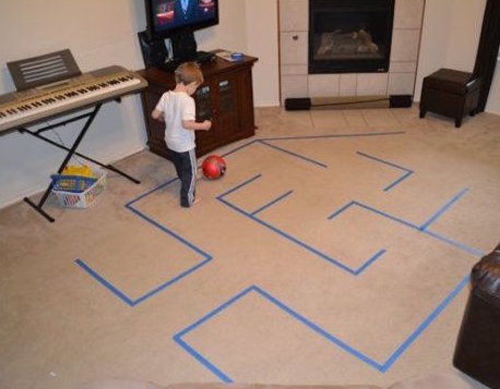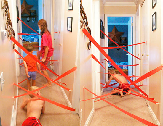 Este juego es perfecto para hacer en casa, si tenéis un pasillo como el de la foto. ¿Se acuerdan de los laberintos de rayos láser que se ven en las pelis de espías? Podemos hacerlos en casa pegando tiras de papel de un lado al otro de la pared, usando cinta de carrocero. Es conveniente que las tiras sean de papel pinocho para que tengan cierta flexibilidad y no se despeguen si bien las tocamos. Los peques deberán llegar de un lado al otro del pasillo sin despegar ni romper ninguna cinta.