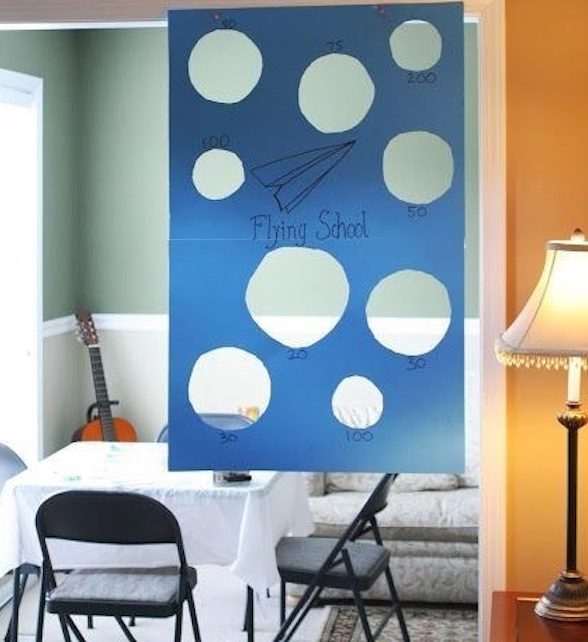 He aquí un juego para niños en casa que combina el tiro al blanco con el lanzamiento de avioncitos de papel. Con una cartulina podéis preparar un tablero con agujeros por el que los peques deberán hacer pasar sus aviones. Podéis darle un puntaje a cada agujero, y colgar el tablero en una puerta.