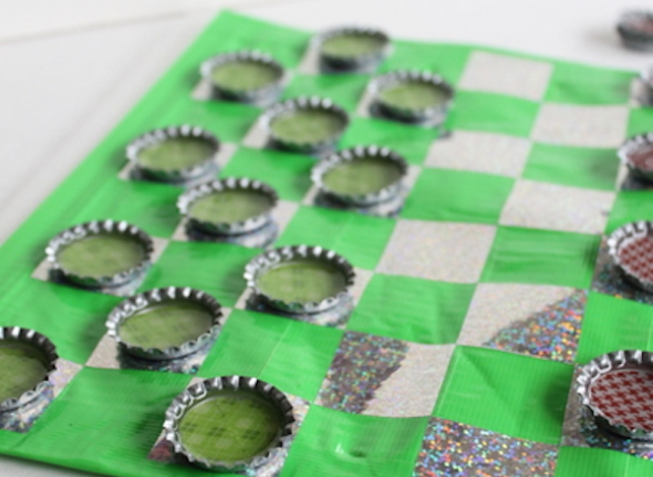 Para hacer un juego de damas casero, que además se puede llevar a la playa porque es impermeable, necesitamos una bolsa de plástico de las que tienen cierre zip, cinta americana, algún vinilo adhesivo y tapones de botellas (también pueden ser de plástico). Forramos toda la bolsa con la cinta americana, luego cortamos cuadraditos de vinilo y los vamos pegando sobre un lado para formar el tablero. Para diferencias las piezas, dentro de los tapones pintamos o pegamos un círculo de cartulina o vinilo, de dos colores diferentes. Las piezas se pueden llevar dentro de la bolsa.