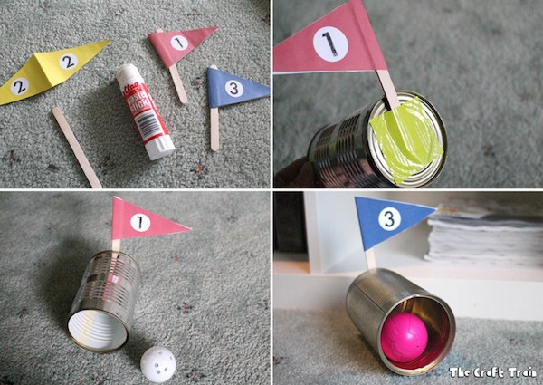 ¿Nos construimos un mini golf en el salón? Necesitamos latas, a las que pegaremos un banderín de papel por detrás con el número de hoyo; también necesitamos una pelotita de ping-pong o similar, y para hacer el palo, usaremos un tubo de papel largo con un óvalo de cartón pegado en la punta. Si no conseguís un tubo largo, podéis probar con escobas de juguete, raquetas, etc.